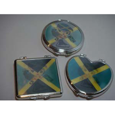 It has mirror on both sides. With 3D picture of flag logo on one side an country girl on the other side. Available in 3 different shapes; circle, square and heart.